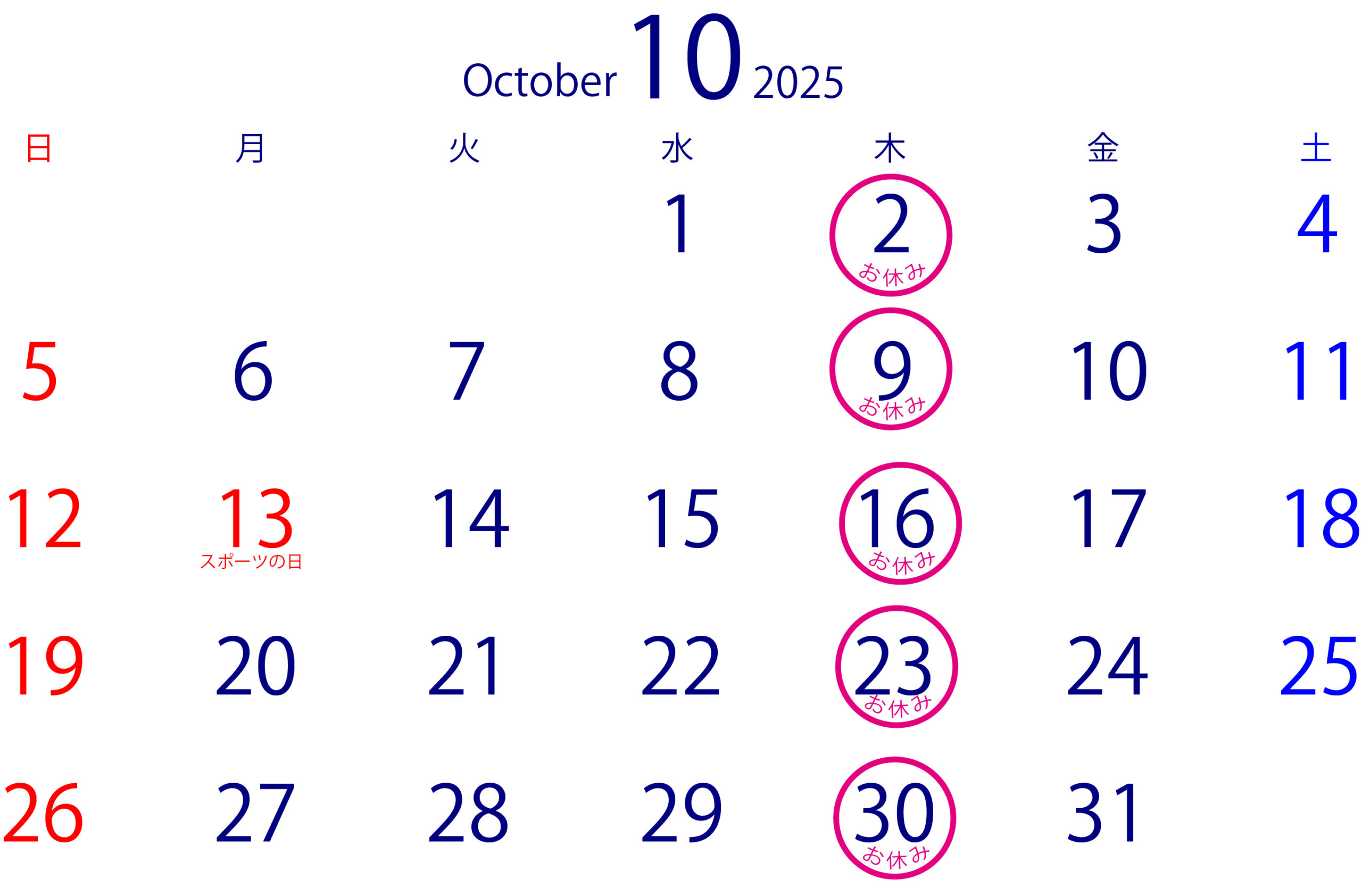 2日(木)9日(木)16(木)23(木)30(木)